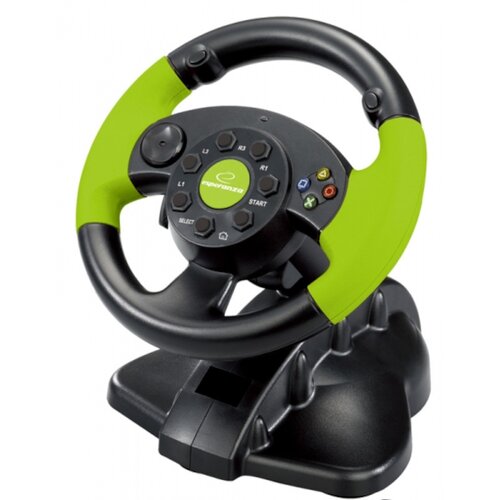 Kierownica Esperanza EG104 to kompaktowy kontroler do gier wyścigowych, oferujący podstawowe funkcje w przystępnej cenie. Wyposażona w 13 programowalnych przycisków, 4-kierunkowy D-pad oraz cyfrowe łopatki zmiany biegów, zapewnia podstawowe możliwości sterowania. Obrót kierownicy wynosi 180°, co pozwala na umiarkowaną precyzję w grach wyścigowych.